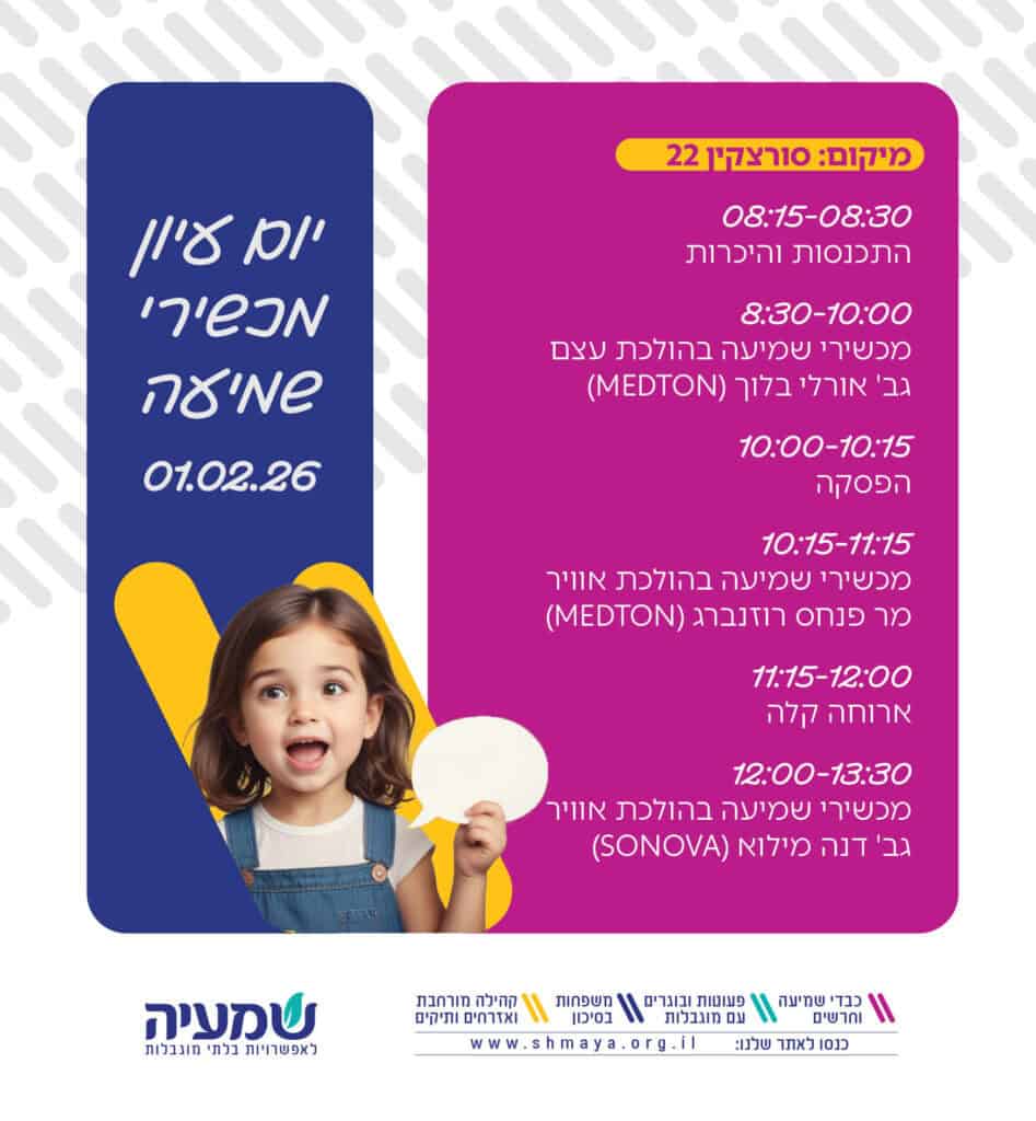 במסגרת השאיפה המתמדת של עמותת "שמעיה" למצוינות מקצועית ולהענקת השירות הטוב ביותר לילדים עם מוגבלות בשמיעה, יערך ביום ראשון הקרוב (01.02.26) יום עיון מעמיק ומקצועי.
